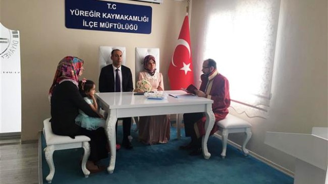 Büyük, şahitler huzurunda yönetmelikte yazılan merasim metnini okuyarak “Evet” yanıtını aldığı çifte, evlenme kütüğünü imzalattı ise evlilik cüzdanını aynı anda gelin ve damada teslim ettikten sonra dua etti.